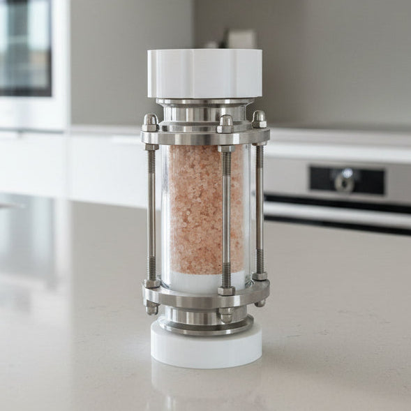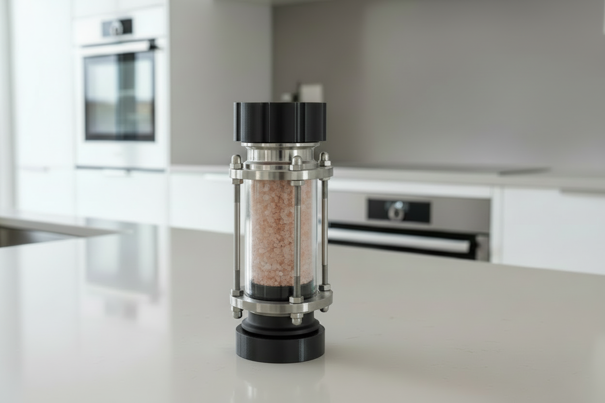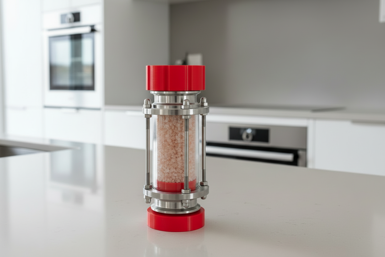 Arguably the most over engineered grinder on the planet. This grinder is made from four components. First, and inline site tube made with glass and airplane grade aluminum. Add to that custom designed and 3D printed inserts at the top on the bottom (here in the red version), a modern car door window handle, and the best mechanism in the world inside, the 25-year guaranteed ceramic adjustable CrushGrind mechanism.